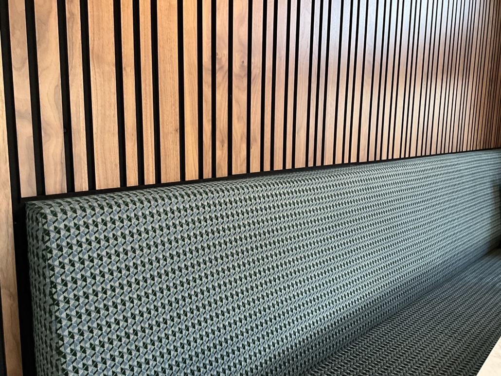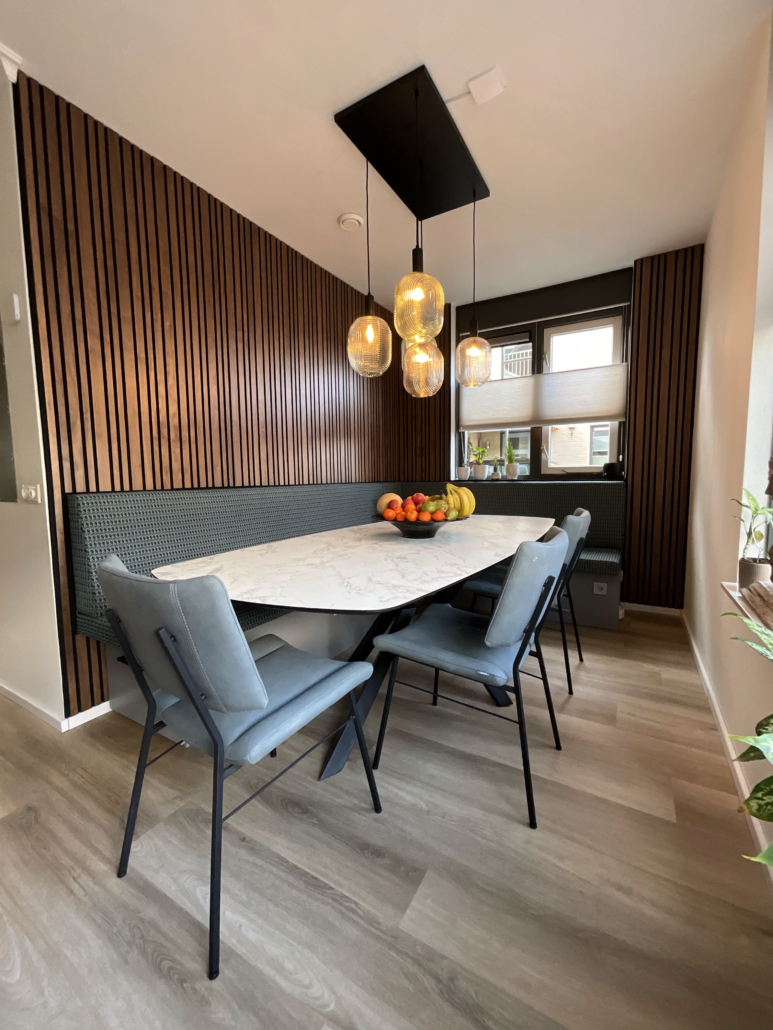 De voormalige keuken werd omgetoverd tot een knusse eethoek met een maatwerk eetbank in een uitgesproken stof. Deze stof combineert prachtig met de gekozen eetstoelen en de eettafel lamp. De kleuren in de eethoek lopen subtiel door naar de nieuwe keuken, waardoor de ruimtes op een natuurlijke manier met elkaar verbonden zijn. Naar de woonkamer toe zijn de kleuren warmer en meer ingetogen, perfect passend bij de haard. Door de breedte van de ruimte optimaal te benutten, voelt de woonkamer bovendien ruimer en optisch groter.