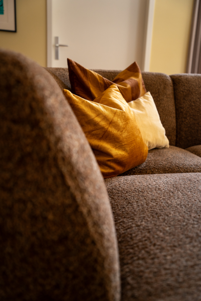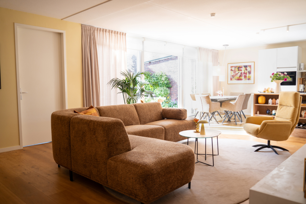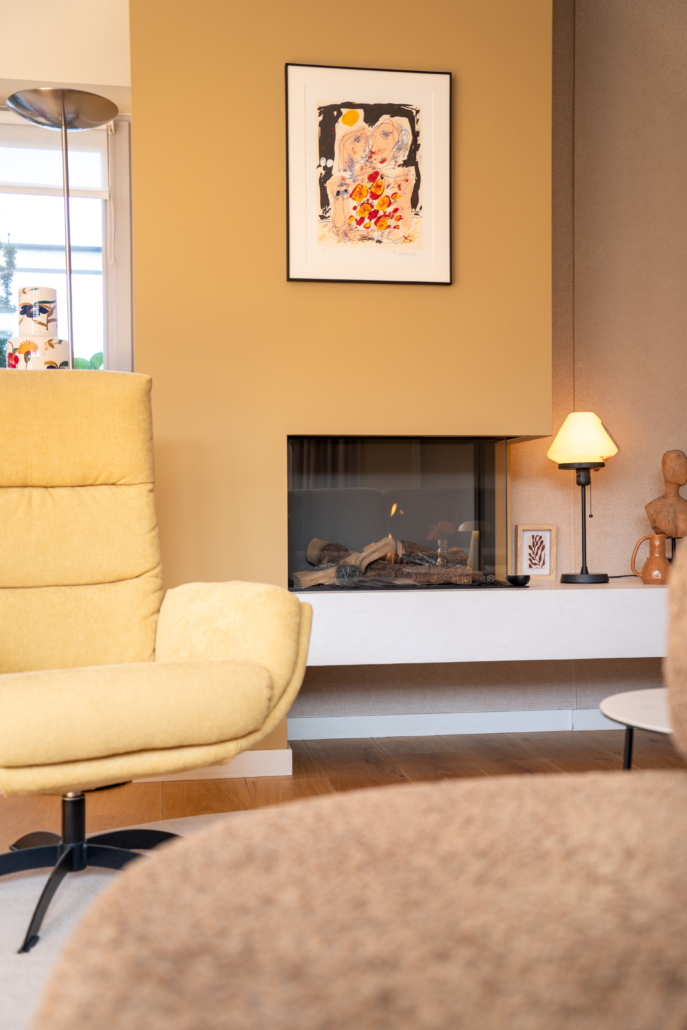 Door bewust te spelen met indeling en accenten hebben we een woonkamer gecreëerd die zowel praktisch als sfeervol is. Er ontstond een natuurlijk looppad, waardoor de ruimte rust uitstraalt en tegelijk knus en gezellig aanvoelt. Met kleurcontrasten en zorgvuldig gekozen materialen hebben we diepte gecreëerd, zodat elk object – van bank tot bijzettafel – zijn eigen plek en functie kreeg.